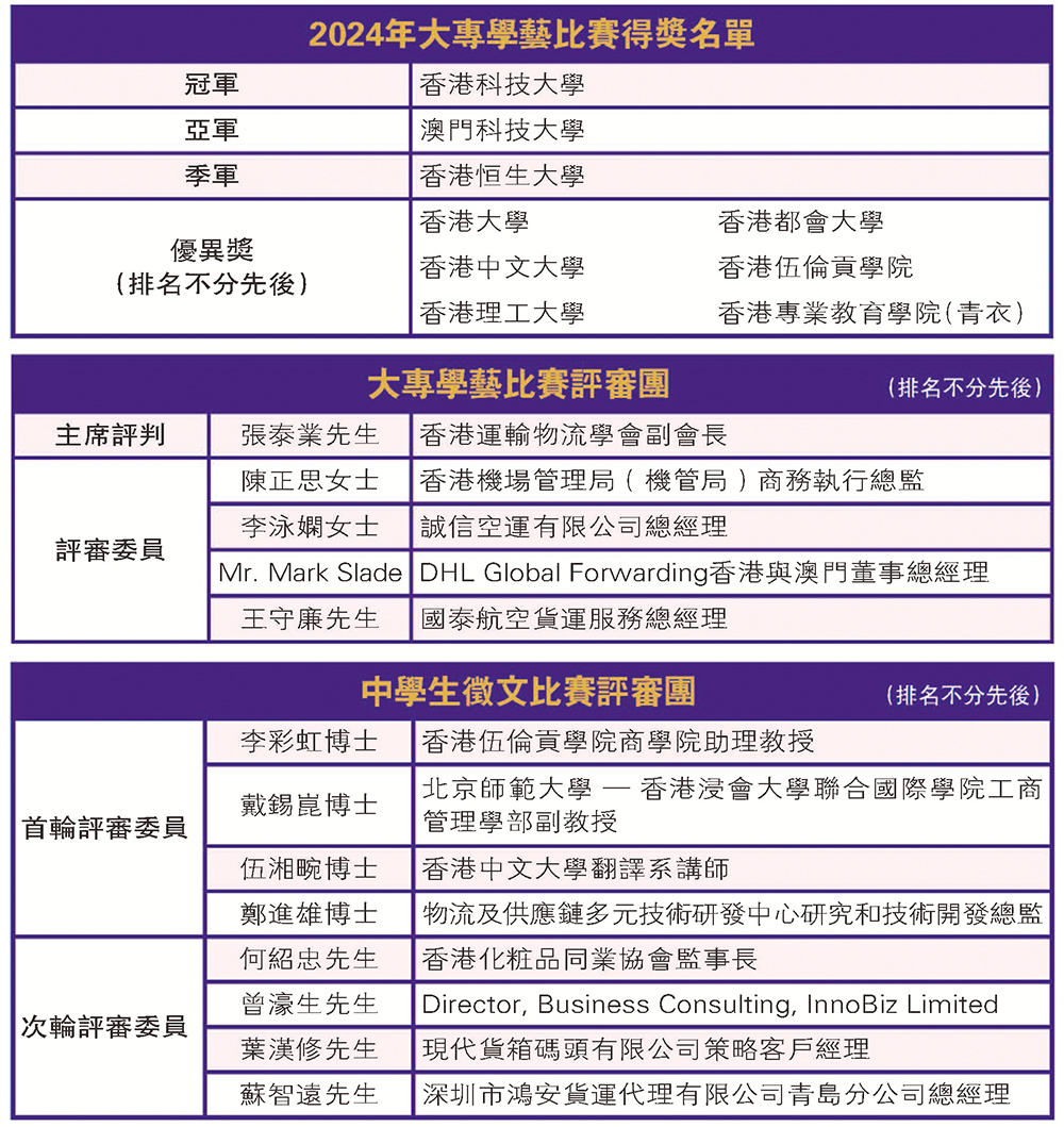 運輸及物流業發展一日千里,尤其是大數據、人工智能、智慧管理等創新科技大派用場。香港作為一個國際航空樞紐,必須與時並進,培育青年專才,發掘行業發展的新機遇。日前,由香港運輸物流學會(CILTHK)主辦、香港運輸及物流局的海運及空運人才培訓基金(MATF)支持下,2024年大專學藝比賽暨「第二十二屆香港運輸物流學會中學生徵文比賽」圓滿舉行,大會以推廣航空物流業為主題,鼓勵新一代集思廣益,探索未來發展的新方向,並提升他們加入航空運輸物流行業的興趣。