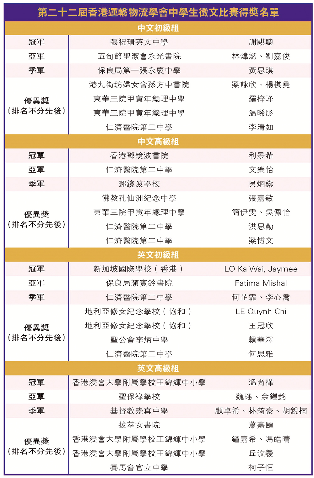香港運輸物流學會大專學藝比賽同場舉行「第二十二屆香港運輸物流學會中學生徵文比賽」頒獎典禮,比賽旨在啟發中學生對本地,以至全球物流運輸業的興趣。今屆大會共收到273份來自52間中學的學生作品。比較去年多出大約一陪的參加者。徵文比賽同樣以推廣航空業為主題,設有四個組別。初級組中文及英文組別的比賽題目是「我心目中理想的飛機餐菜式」;高級組中文及英文組別的題目則是「你會提出什麼建議去提升香港機場旅客的機場體驗?」。鼓勵學生天馬行空,勇敢想像未來航空旅程是何等的新體驗。
