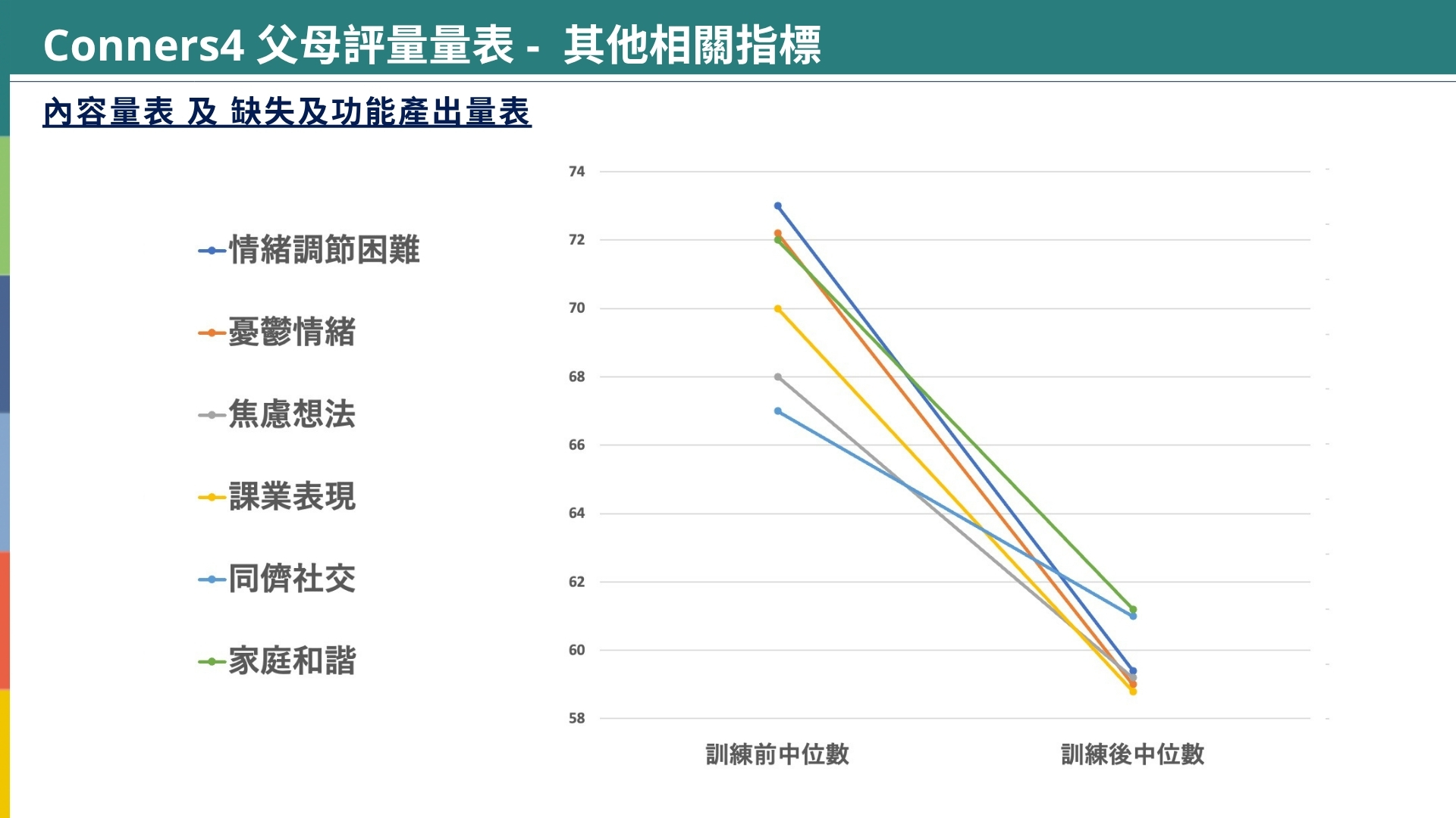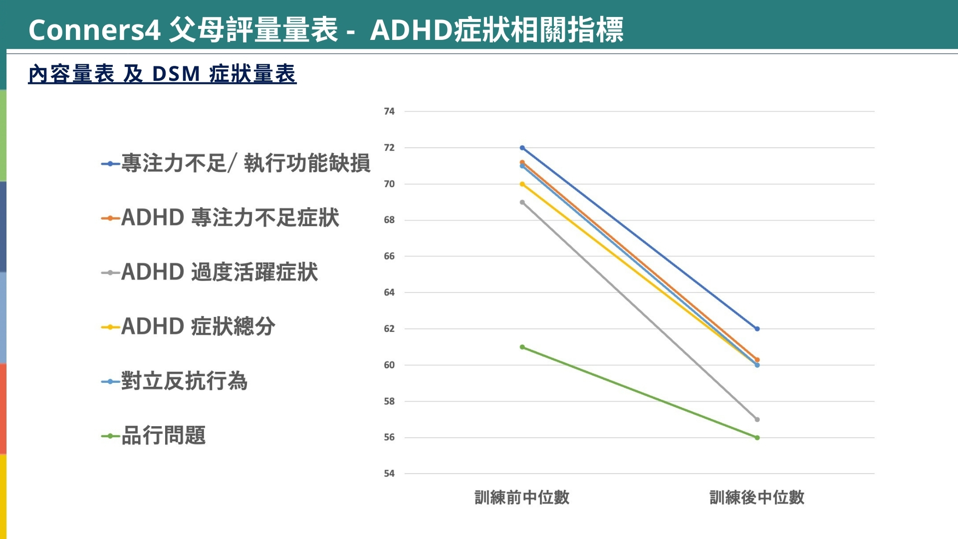 研究顯示,參與學童經過40節腦神經認知訓練後各項表現評分均有上升,包括專注度、執行功能、抑制衝動能力、抑制過動行為、情緒管控等。而在Conners 4父母評量量表的數據分析亦顯示參與學童在ADHD症狀、情緒調節、學業、社交等範疇有顯著改善。