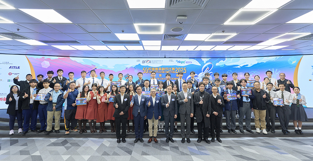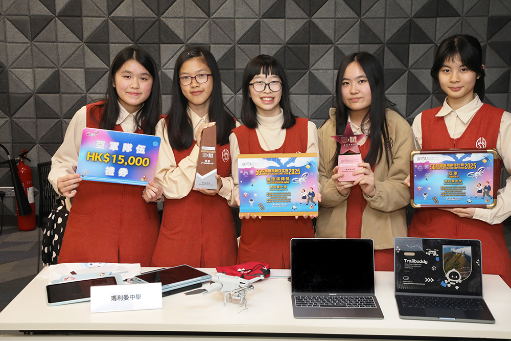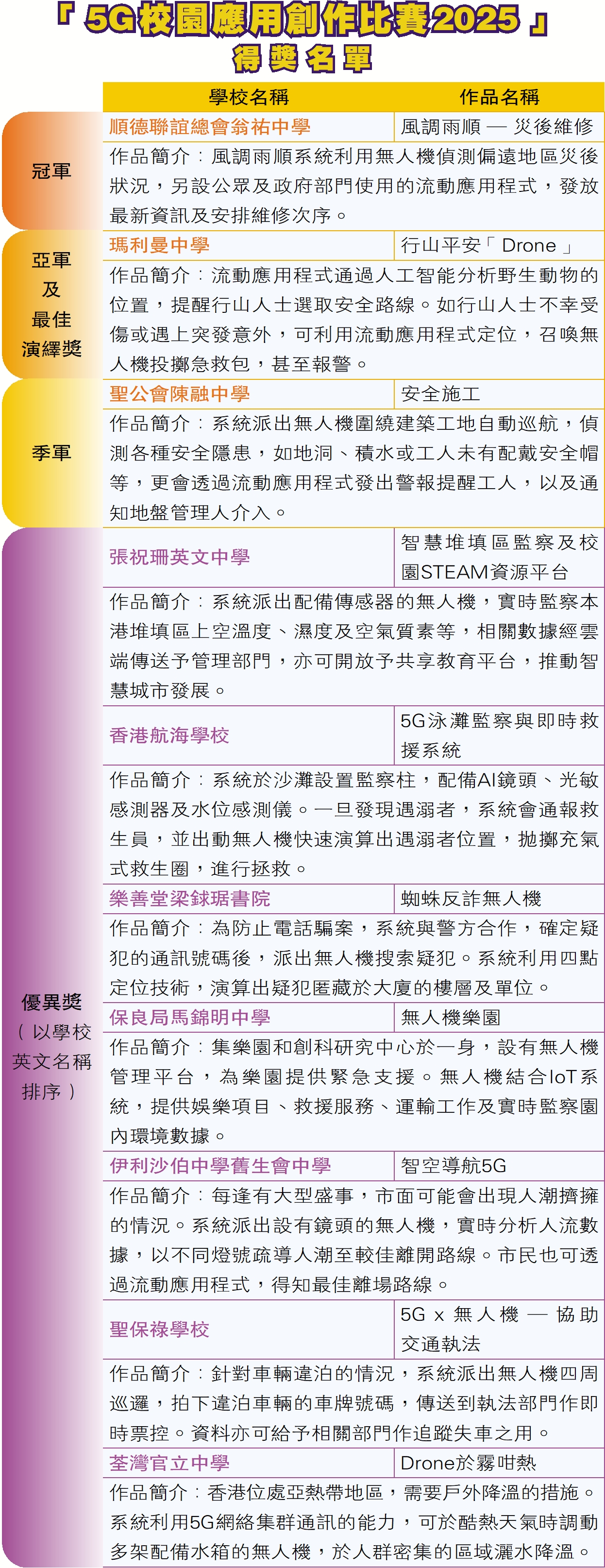由通訊辦主辦、香港生產力促進局(生產力局)協辦的「5G校園應用創作比賽2025」,自2023年首辦以來已進入第三屆,累計已獲逾百所學校鼎力支持參與,推動校園創科教育,成效顯著。本屆比賽於2025年5月正式展開序幕,分多階段進行,先後開展啟發培訓課程、無人機操作訓練及開發流動應用程式等指導環節,全方位提升及協助參賽學生為比賽作好準備。大會於8月初從48個來自38間學校的參賽作品中選出十個入圍決賽作品。十隊決賽隊伍在11月初提交決賽項目計劃書,並於12月6日決賽當天,親身向評審團展示及解說其作品的設計概念和應用。決賽評審團由通訊辦代表,以及學術界和研究機構的專家組成,包括生產力局首席數碼總監黎少斌、香港通訊業聯會主席劉貴顯、香港理工大學專業進修學院院長陳繼宇博士,以及香港科技園高級項目經理(人工智能及數據)林少華。他們從十個決賽作品中根據比賽評審標準選出冠、亞、季軍。比賽最終由順德聯誼總會翁祐中學隊伍奪得冠軍殊榮、瑪利曼中學獲頒亞軍及最佳演繹獎,而聖公會陳融中學則獲得季軍;另外7所學校獲頒優異獎。